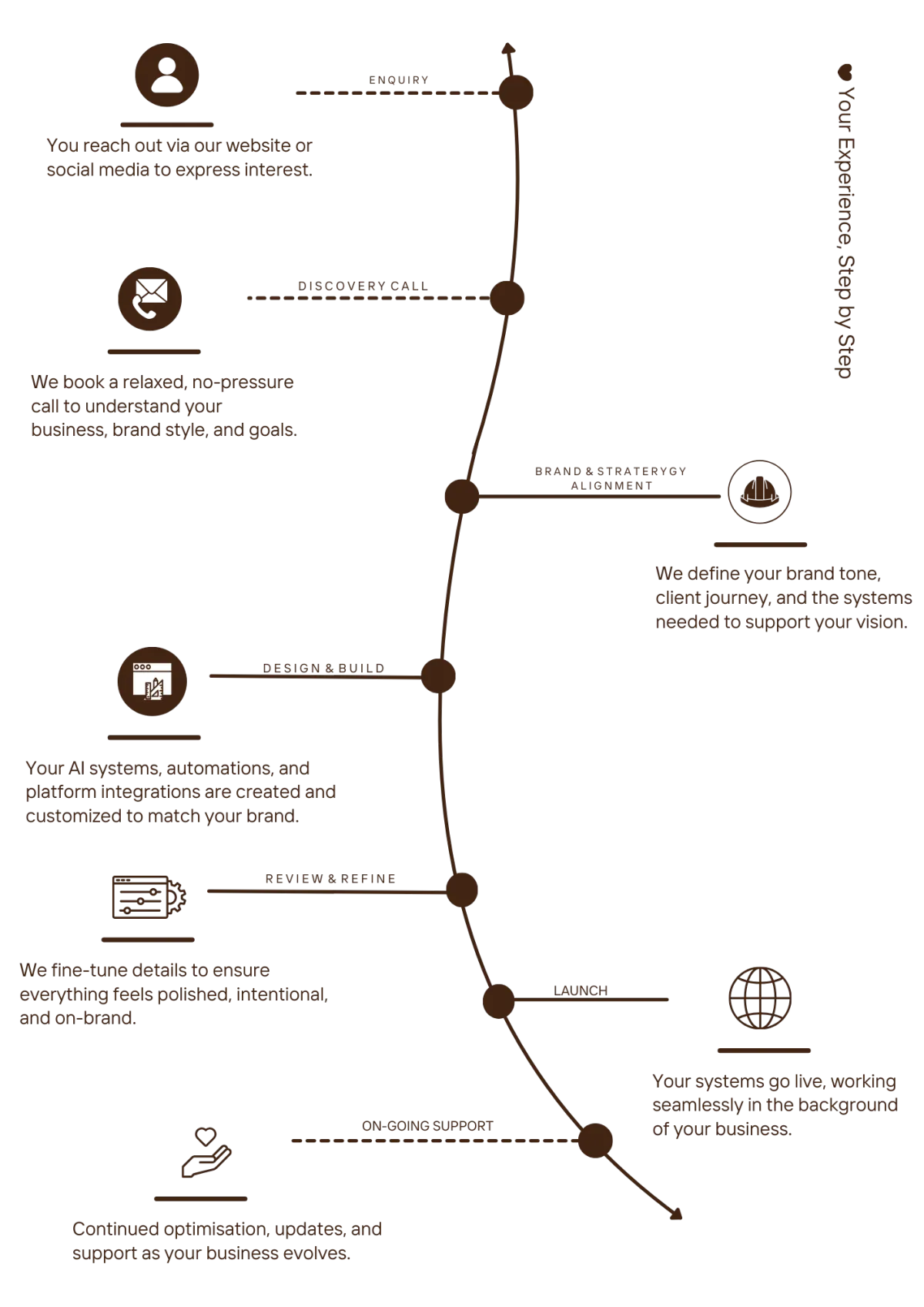 We work closely with you to translate your brand into a seamless, elevated digital experience that feels considered, consistent, and unmistakably yours. From tone of voice to visual flow, we ensure your branding is carried effortlessly across every platform — your website, social media, and automated touchpoints — so your business presents as polished and cohesive at every interaction. Our approach is calm, intentional, and detail-driven, allowing your brand to feel warm, professional, and confidently aligned, while the systems behind it work quietly to support your growth.